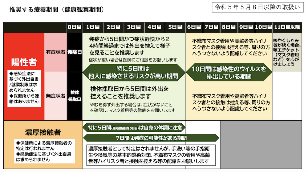 現在宮城県のホームページで公開されている以下の最新の推奨の療養期間の画像を参考になさってください。